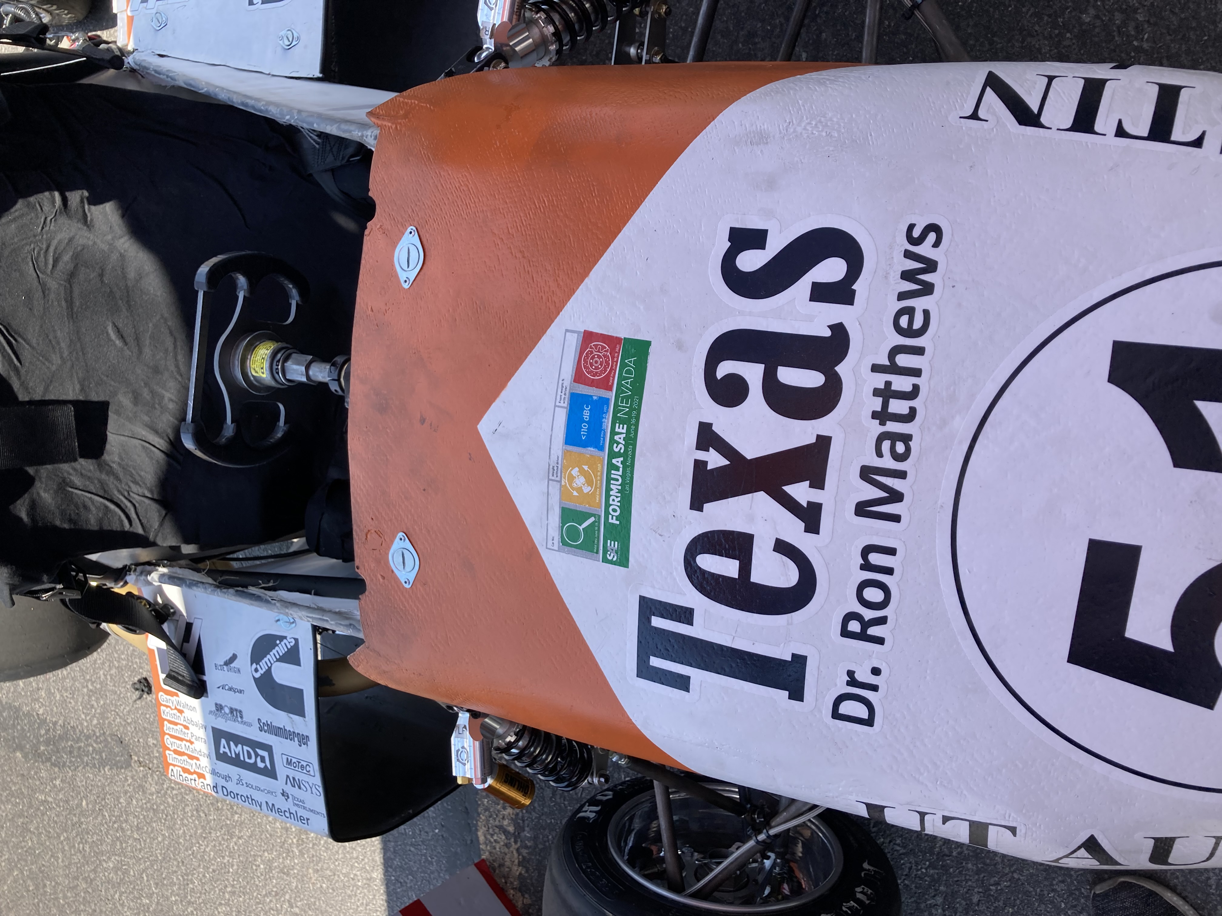 Finally in May 2021, the school allowed us limited access to our machine shop and garage. Then, somehow, five weeks later, the night before we had to leave for Las Vegas Speedway, we had a finished car. Several things still had to be finished in the Las Vegas heat upon arrival, but we made it to inspection the next day and failed miserably. Our cockpit did not pass template, and we had many alterations to make to be rules compliant. The team worked overnight to mend every issue, and the next day, we made it all the way through inspection and were able to successfully lock up all four brakes in the brake test. Unfortunately, the car was plagued with fueling issues after inspection and we could not resolve them in time to compete in any dynamic events.